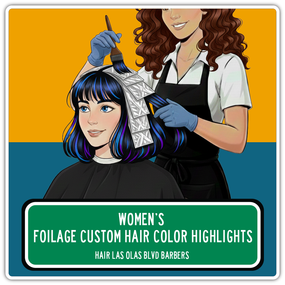 Enhance your hair with our Foliage Color service at Hair Las Olas Blvd Barbers. This modern coloring technique places foils on hair that has been pre-painted, creating brighter, more dimensional results than traditional balayage. The lifted highlights blend seamlessly with your base color, giving you bold yet natural-looking lightness from root to ends.